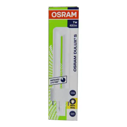 Each compact fluorescent lamp of this range has a base type G23 with 2 metal pins. Osram DULUX S 7W/830 G23 Lumilux Warm Whitelamps have a size of 13.7 cm.